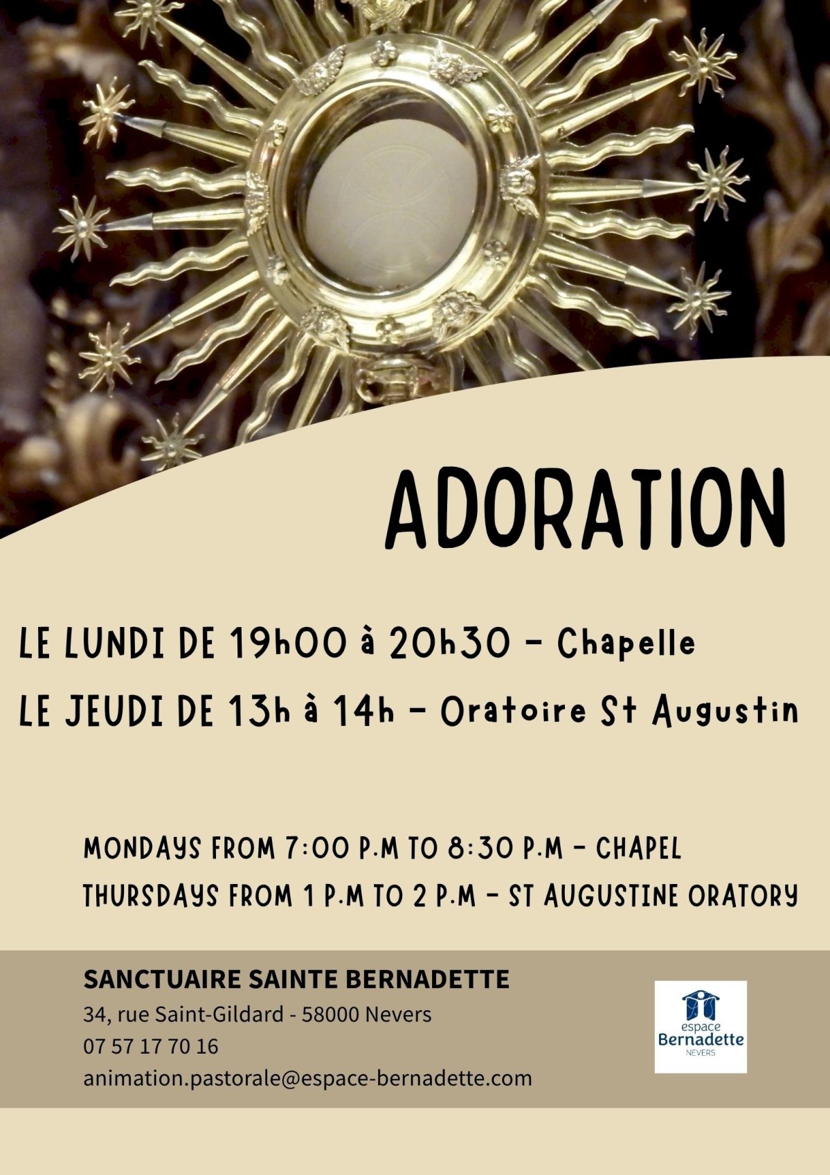 Adoration le Lundi de 19h à 20h30 et le Jeudi de 13h à 14h.